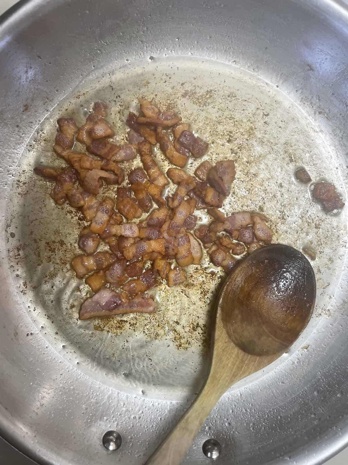 - Cook the bacon in a large skillet over medium high heat until browned and crisp. With a slotted spoon remove bacon to a paper towel to drain.