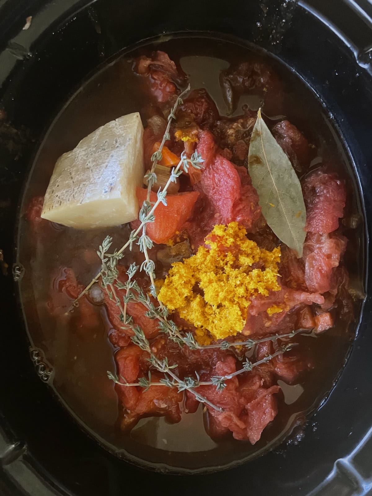 - Add the tomatoes, parmesan rind, bay leaf and thyme sprigs to the slow cooker. Set the slow cooker to high for 4 hours or low for 7 to 8 hours.
