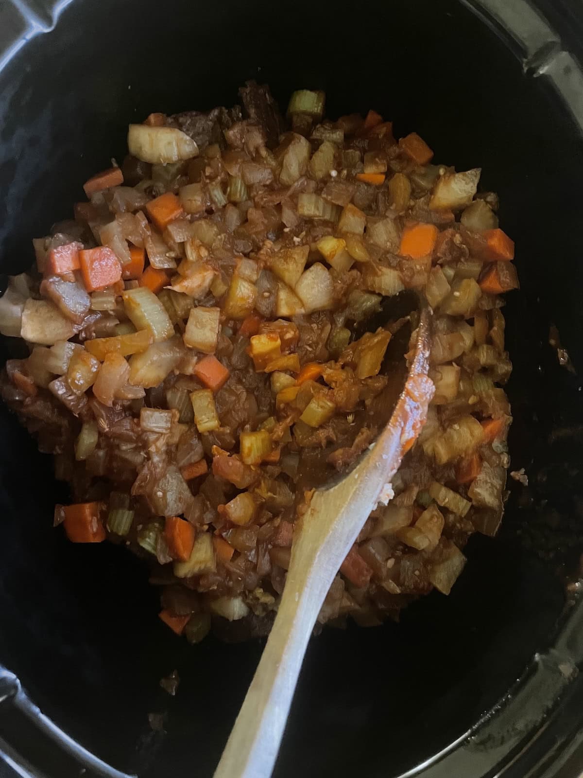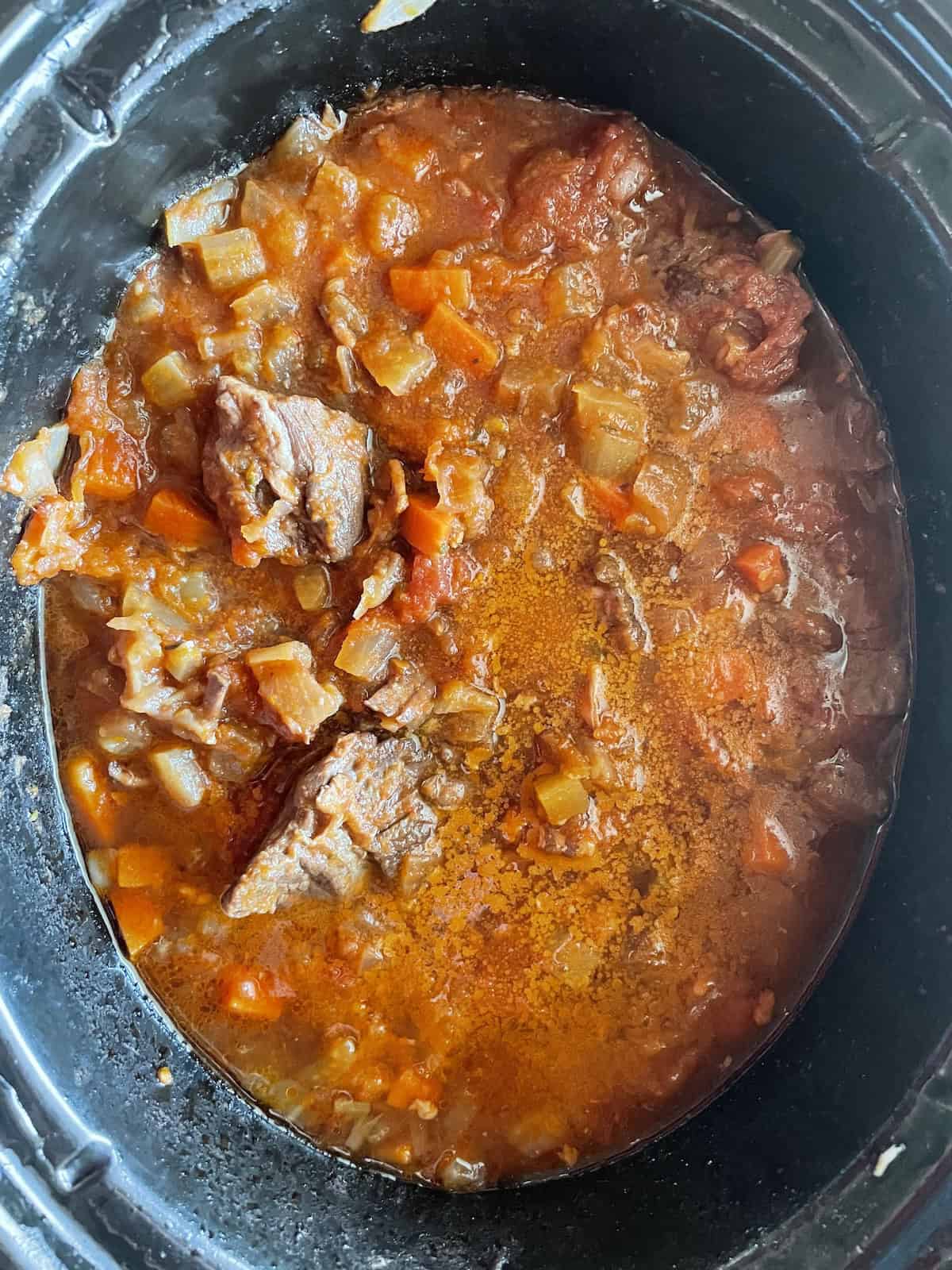 - Add the red wine and deglaze scraping up any remaining brown bits. Transfer the mixture to the slow cooker.