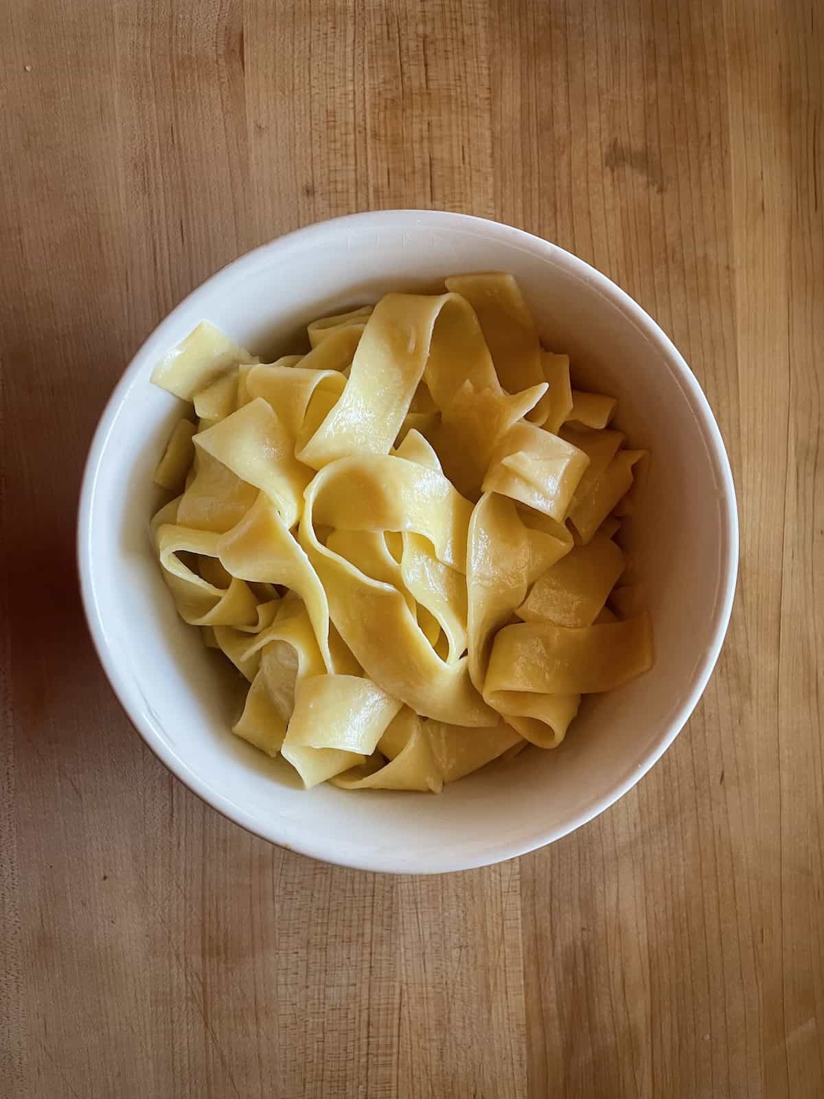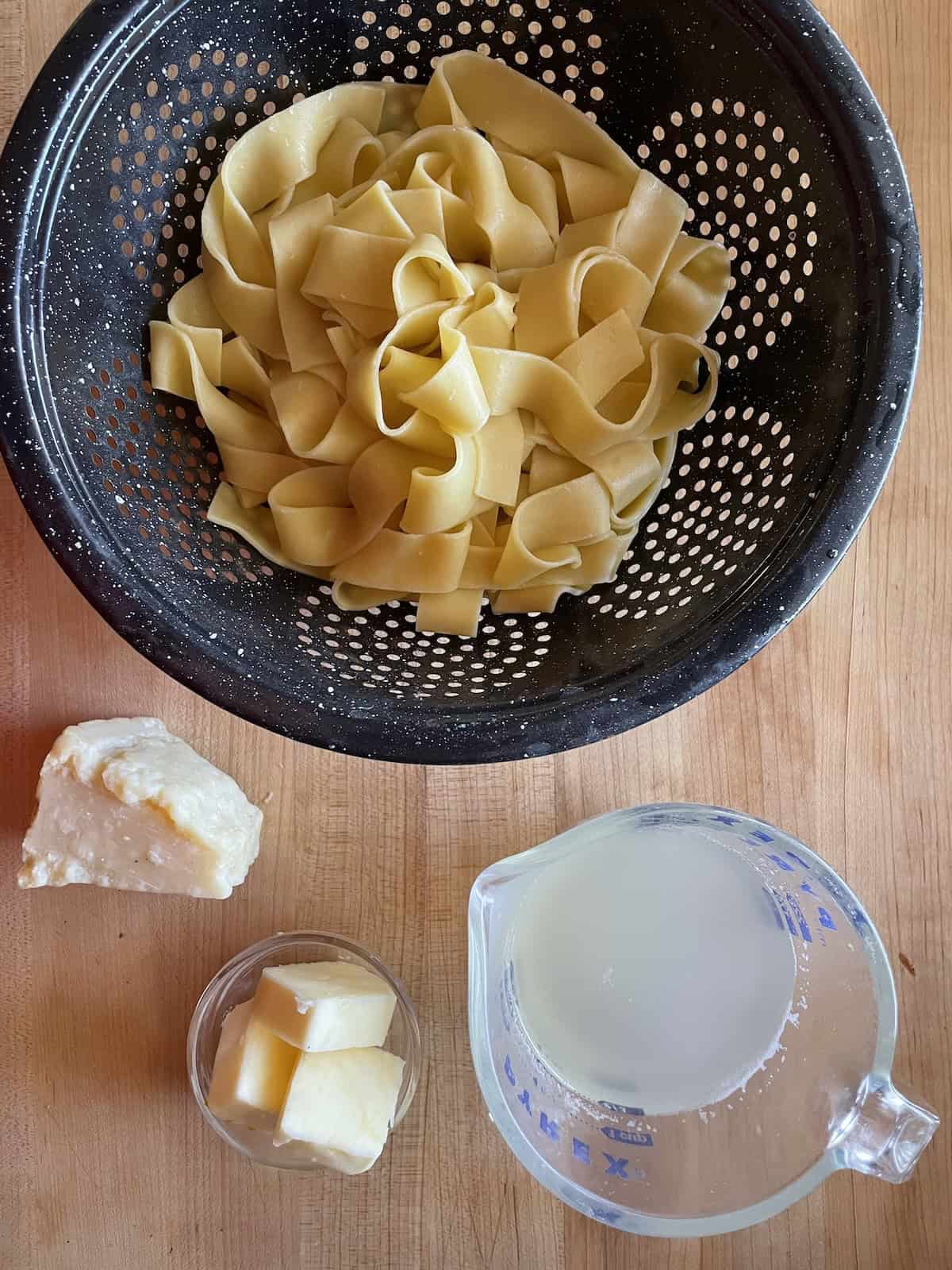 - Prepare the pappardelle or tagliatelle according to package directions, reserving one cup of pasta water. Toss with butter and parmesan cheese and thin with reserved pasta water.