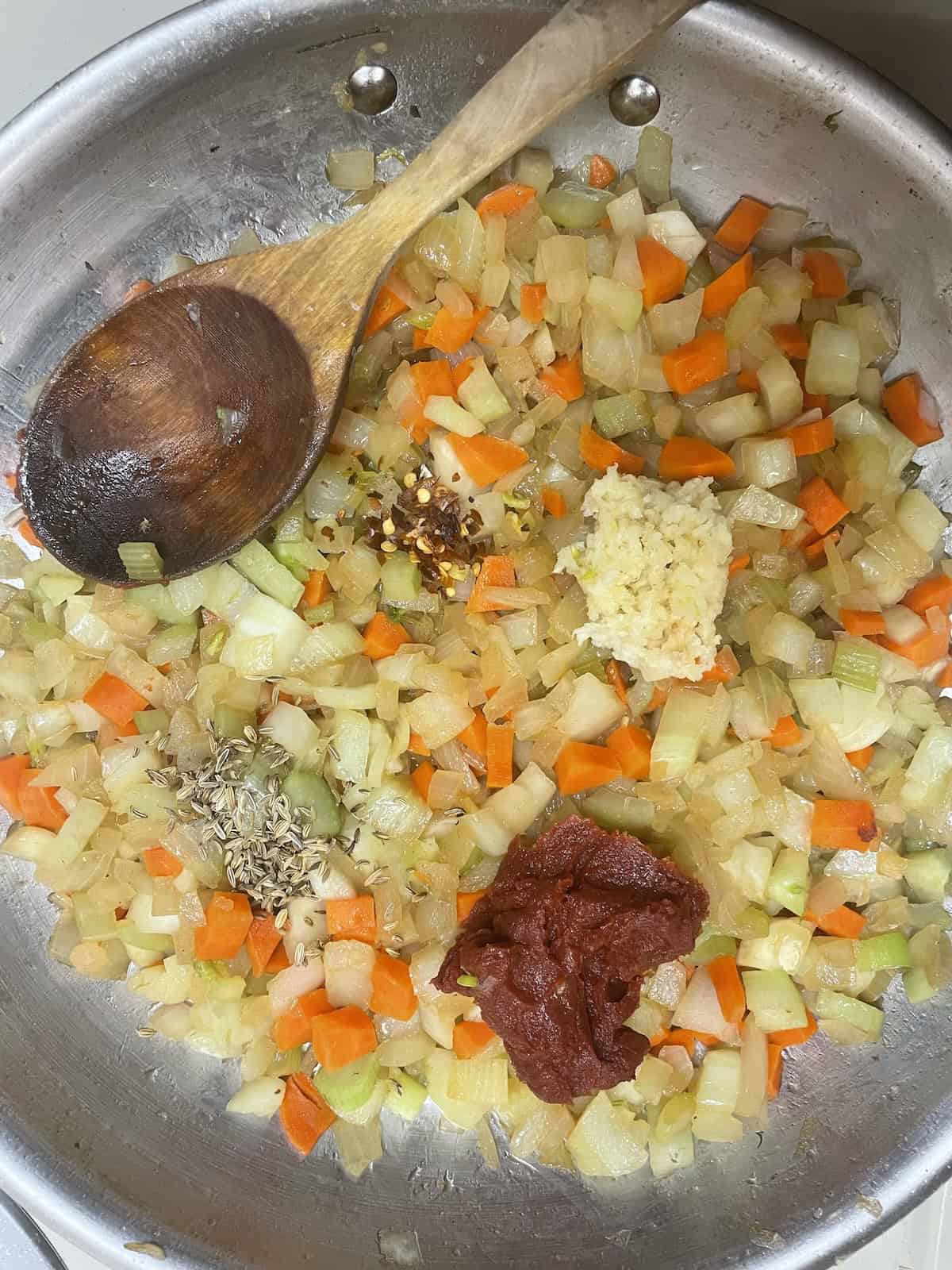 - Add the remaining tablespoon olive oil to the skillet. Add the fennel, onion, carrot and celery. Season with salt and pepper. Cook, scraping up brown bits from the bottom of the pan with a wooden spoon, about 5 minutes until vegetables are softened. Add the minced garlic, tomato paste, fennel seeds and red pepper flakes, stirring until tomato paste has deepened in color and is fragrant.