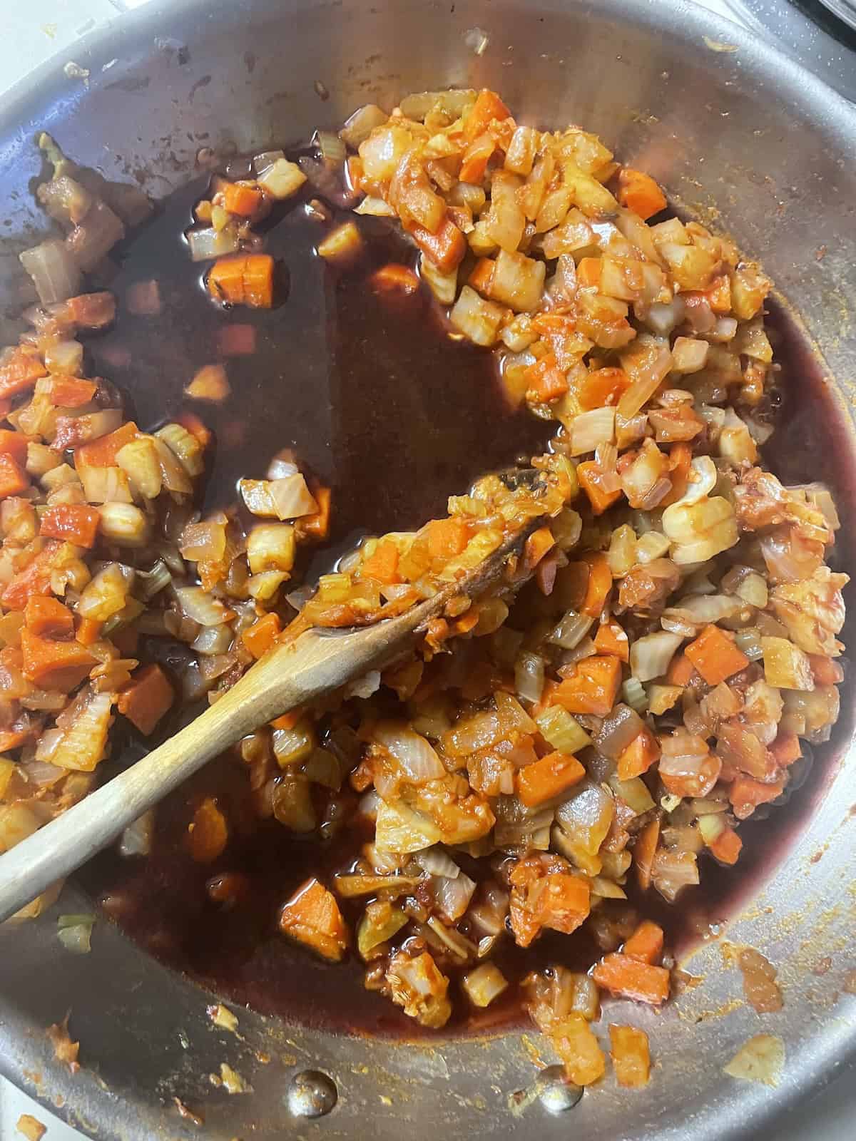Stir until tomato paste has deepened in color and is fragrant.